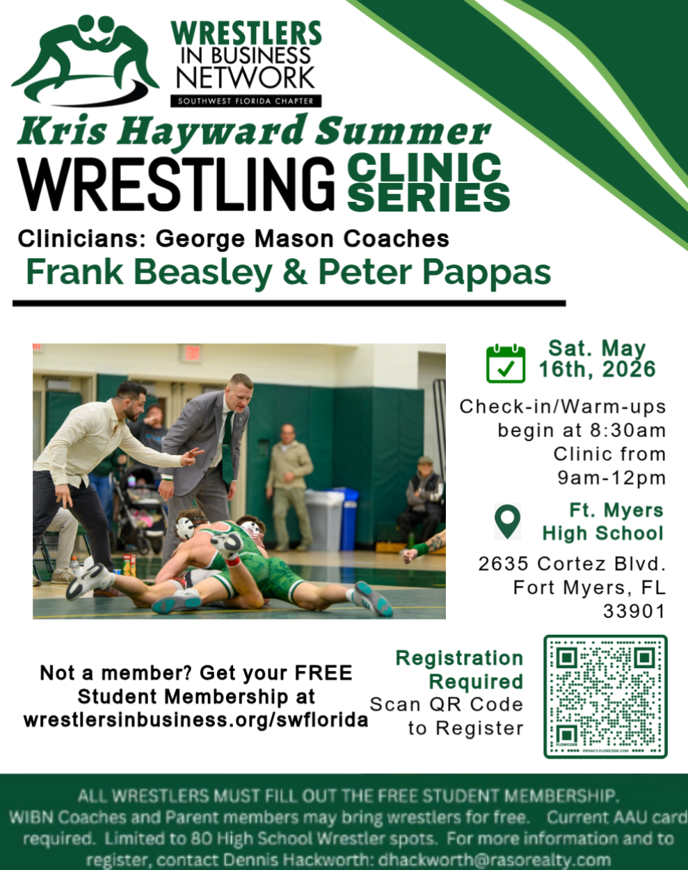 SW Florida's - Kris Hayward Summer Wrestling Clinic Series with Clinicians: George Mason Coaches - Frank Beasley and Peter Pappas Saturday, May 16, 2026 8:30 AM 2:00 PM 08:30 14:00 Ft. Myers High School 2635 Cortez Boulevard Fort Myers, FL, 33901 United States (map) Google Calendar ICS Register Now Not a member of the WIBN SW Florida, click here to join!*Students under the age of 16, must be registered by their parent.