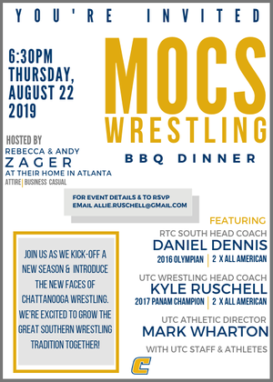 Join the Wrestlers in Business Network Atlanta Chapter for a special networking event on Thursday, August 22nd at 6:30pm! Come enjoy some great BBQ and great company as we support the UTC MOCS Wrestling program. This is your chance to enjoy a wonderful evening with those that share your love for the sport of wrestling. All are welcome! We look forward to seeing you there!