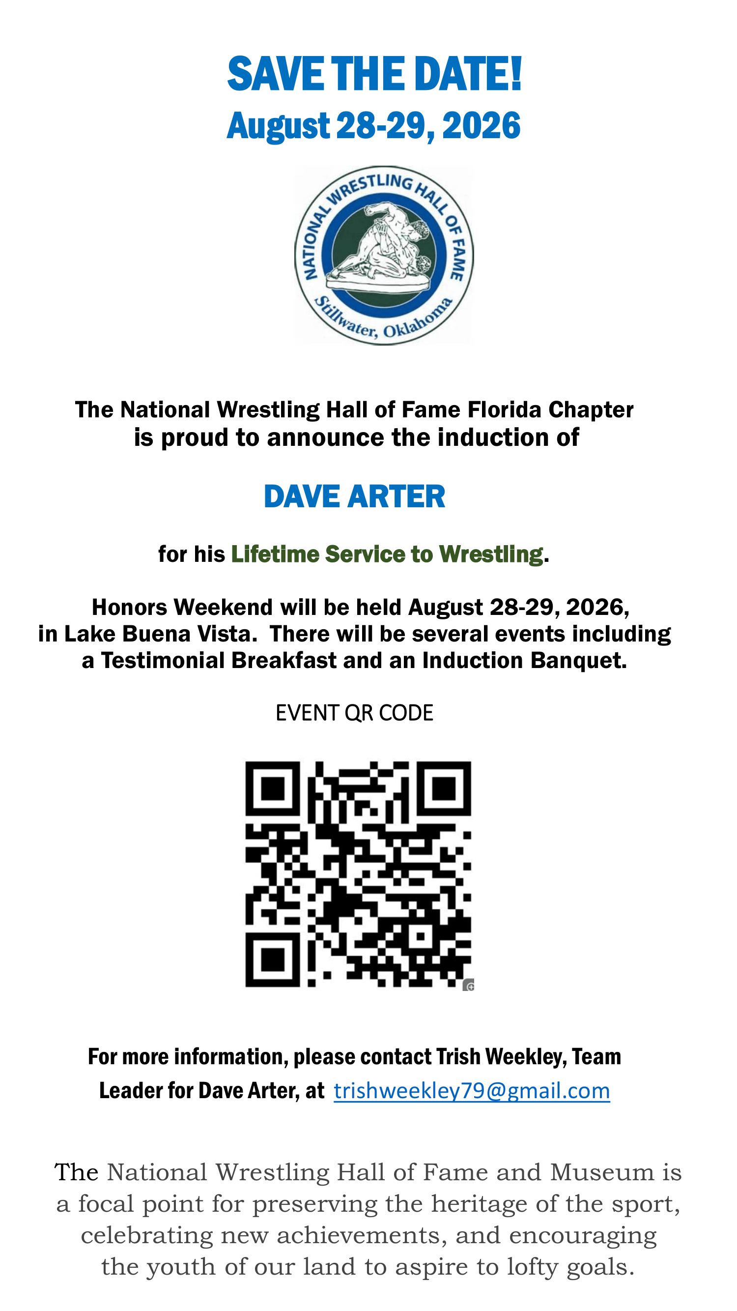 WIBN SW Florida's own Dave Arter is being inducted... Congratulations to Dave Arter on being inducted into the National Wrestling Hall of Fame - Florida Chapter Event tickets Thomas FallisApril 20, 2026WIBN SW Florida Facebook0 Twitter LinkedIn0 Reddit Tumblr Pinterest0 0 Likes